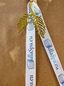 Wstążka satynowa 10 mm biała z logo w kolorze metalicznym - 100 metrów