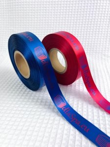 Wstążka satynowa 10 mm kolorowa z logo w kolorze metalicznym - 100 metrów